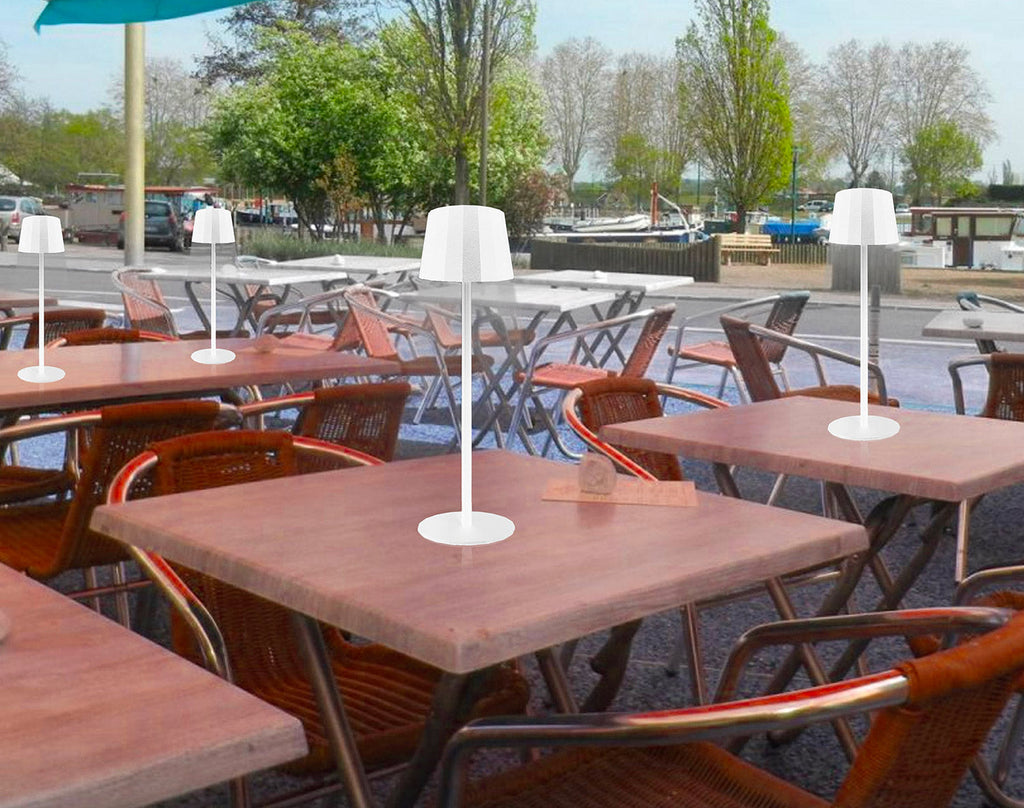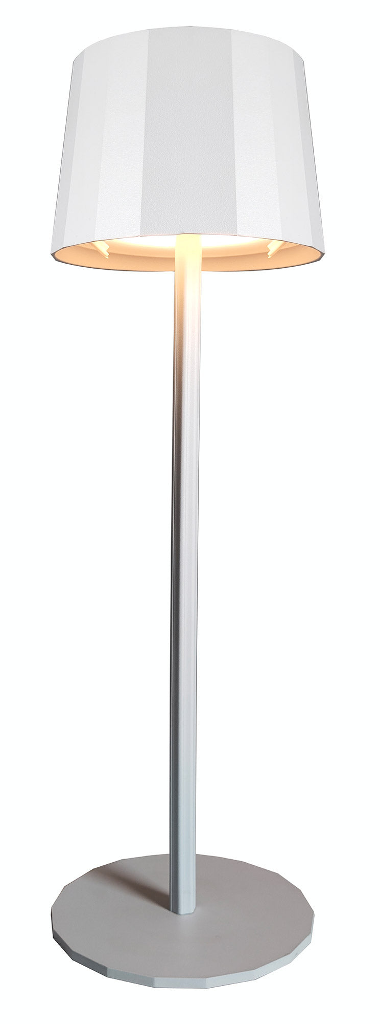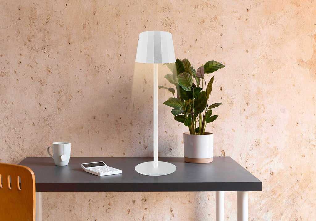 Questa lampada da tavolo è realizzata in ferro per la base e lo stelo, mentre il paralume è in alluminio, conferendole un aspetto elegante e moderno. È dotata di funzione dimmerabile e accensione touch, senza la necessità di fili. Inoltre, può essere ricaricata tramite porta USB. Le sue dimensioni sono di 11,5 cm di diametro e 38 cm di altezza, con un colore predominante bianco.