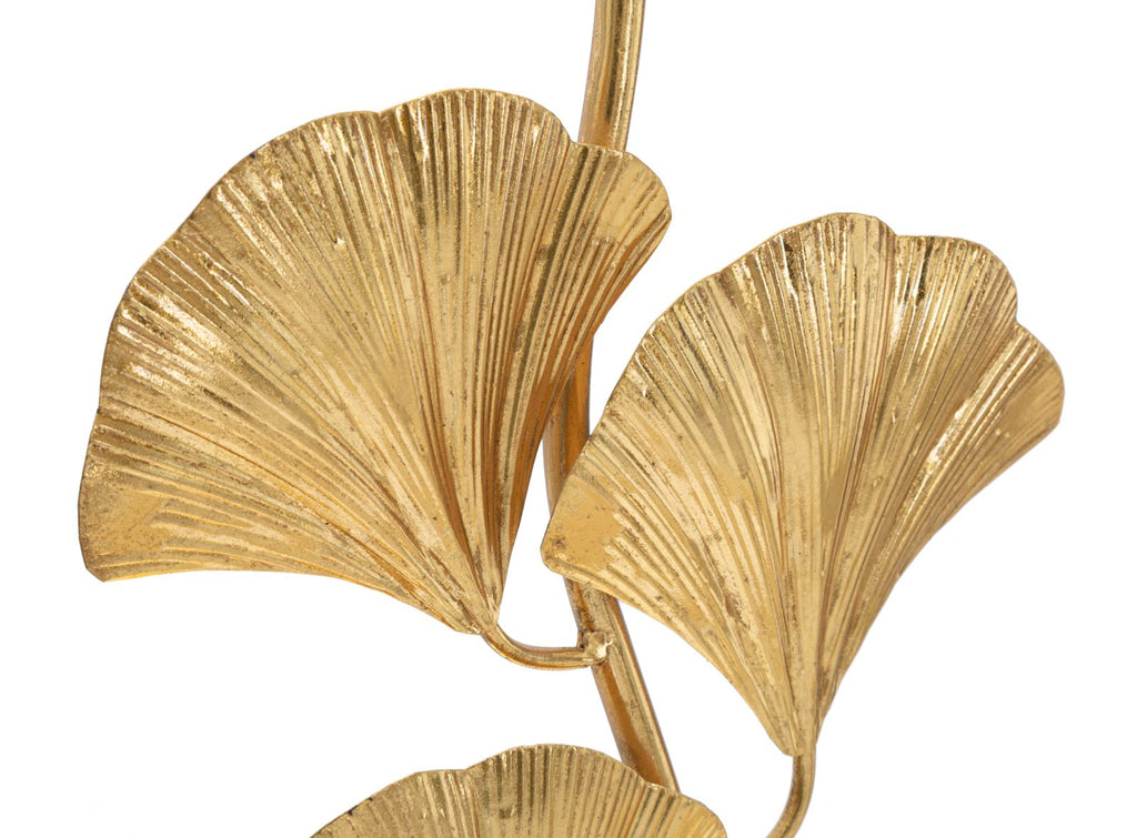 Tischlampe aus goldenem Metall mit Lampenschirm aus weißem Stoff. Die Basis aus Blättern erinnert an die Natur und das Gesamtdesign erinnert an eine Pflanze.