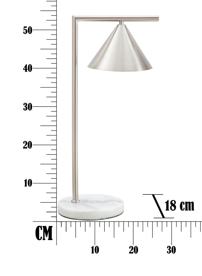 Tischlampe aus silberfarbenem Metall mit Marmorsockel. Der konische Lampenschirm zusammen mit den essentiellen und klaren Linien der Struktur machen die Gloty Tischlampe zu einer perfekten Mischung aus Modernität und Eleganz!