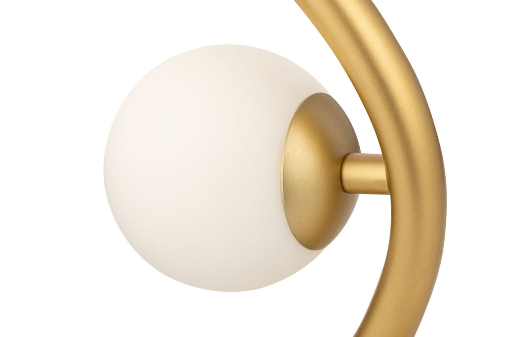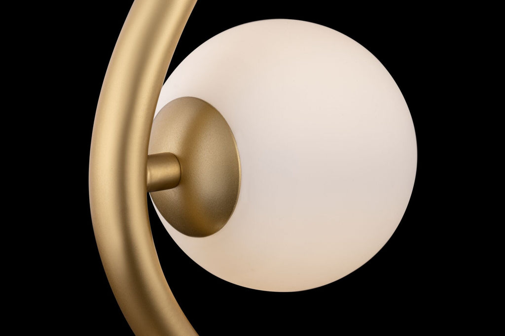 Die Diffusoren aus Opalglas sind auf der wellenförmigen Metallstruktur platziert. Serienmodelle werden in Gold- und Chromfarbe präsentiert.