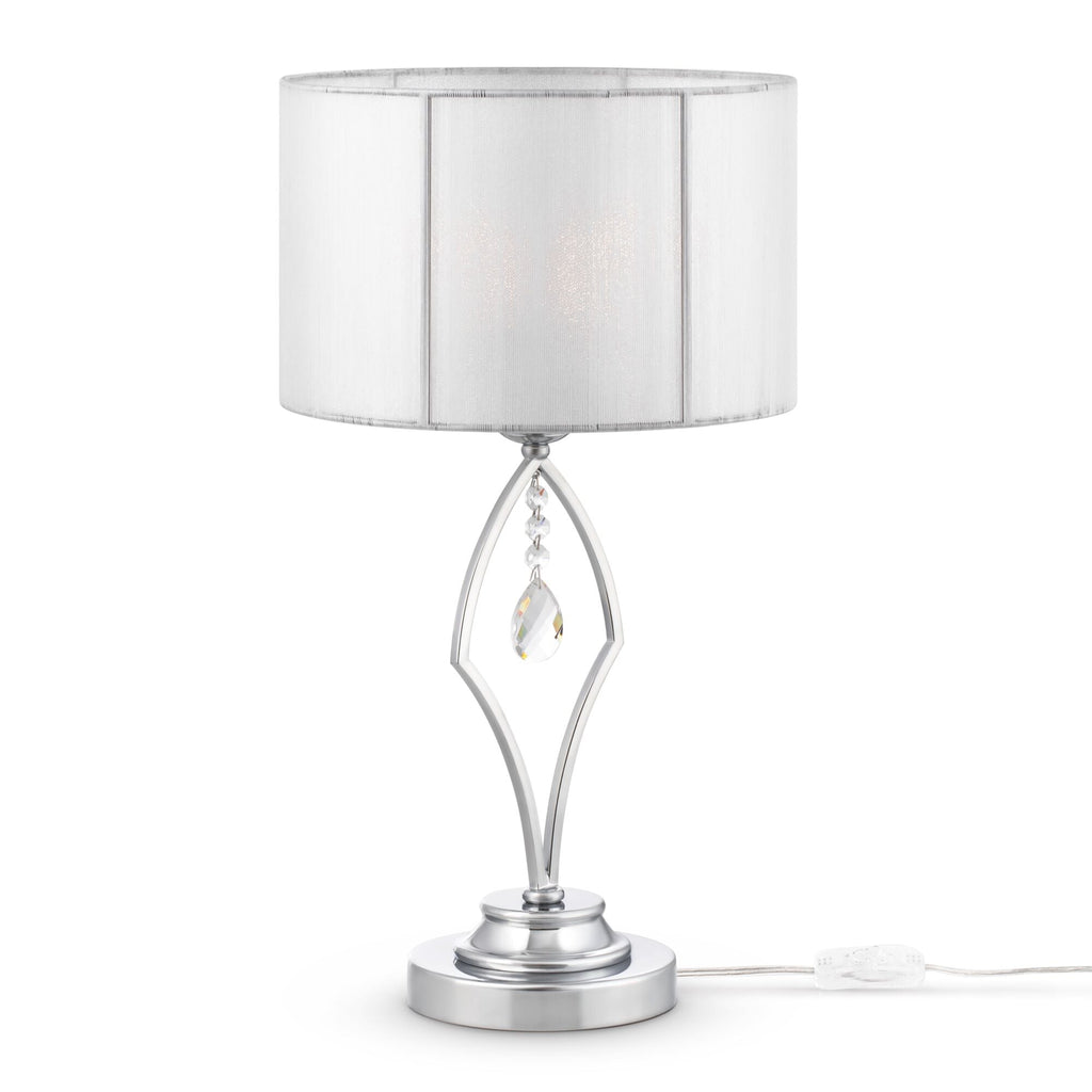 Metallstruktur, verchromt. Dekorative Kristallanhänger. Lampenschirm aus weißem Faden.