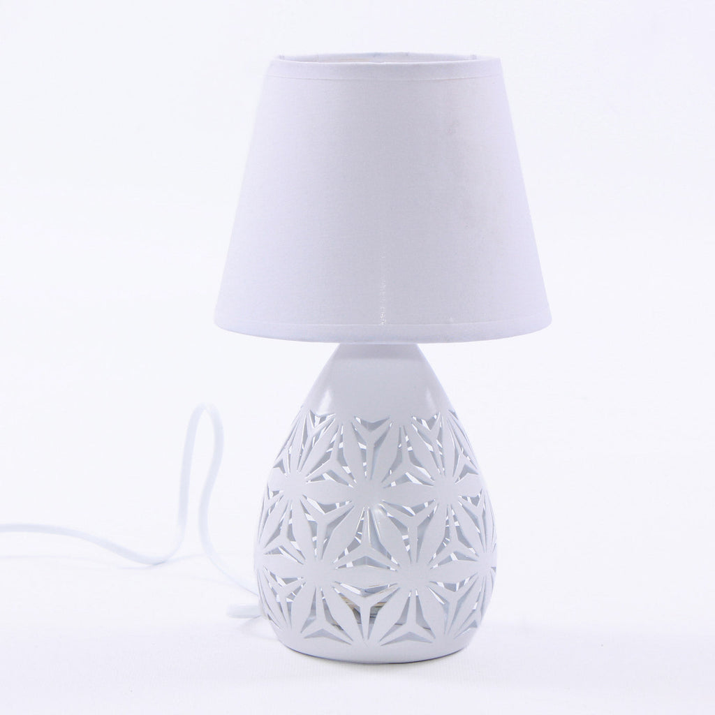 Lampada da tavolo con base bombata a forma di uovo in metallo bianco traforato e cupola bianca in tessuto. Design moderno. Utilizzabile come abatjour per la camera da letto o in ogni ambiente di casa.
