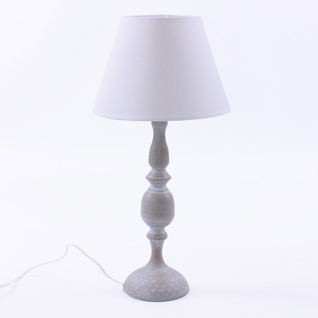 Lampada da tavolo con base in metallo grigio anticato e cupola bianca in tessuto. Utilizzabile come abatjour, in salotto o in ogni ambiente di casa. Shabby chic.