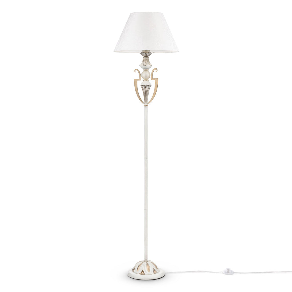 Struktur aus Metall, Finish in Weiß und Gold. Dekorative Perlen und gemusterte Lampenschirme.