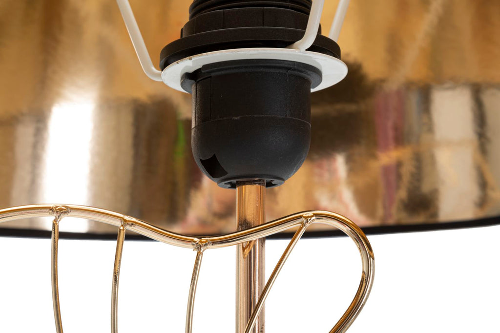 - È realizzata in metallo dorato con paralume in tessuto nero, creando un contrasto perfetto