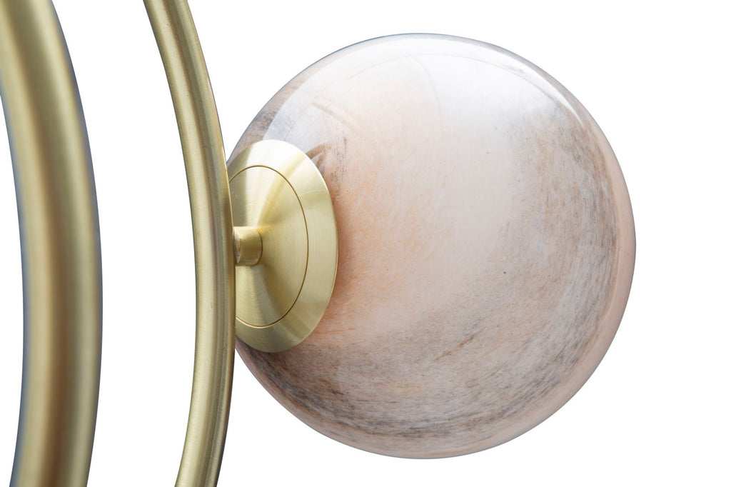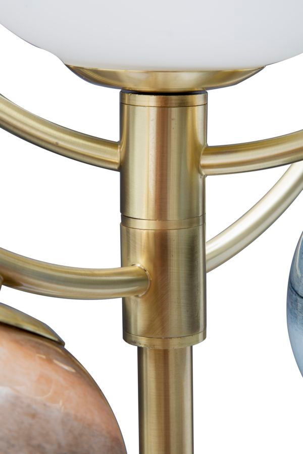 Stehlampe mit 7 Lichtpunkten aus goldenem Metall mit opaken Glaskugeln, die ein zartes und durchdrungenes Licht streuen. Hervorragende Lampen, die das Sonnensystem reproduzieren. Ein Hauch von Glamour und moderner Astronomie in Ihrem Zuhause.