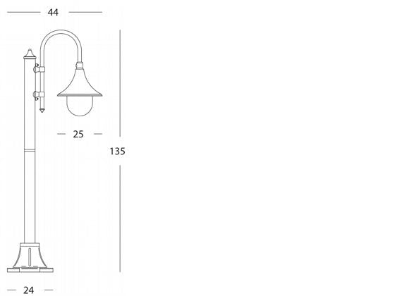 Schwarze Pollerlampe für die Lampara-Linie im Freien. Struktur aus Aluminium-Druckguss. Korrosionsschutzbehandlung. Epoxid-Pulverlackierung. Diffusor aus transparentem Thermoplast. Reflektor aus Aluminium. E27-Lampenfassung aus Porzellan. Inklusive Befestigungszubehör. Geeignet für Glühlampen. Für Energiesparlampen geeignet. Max. Lampenhöhe mm 150. Stromversorgung 230 V ~ 50 Hz. Anschlussvorrichtung. Bodenbefestigungsdreieck. Schutzklasse: IP43 Maximale Lampenleistung: 60W