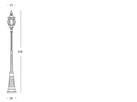 Hochmastleuchte für Garten in grauer Farbe für Maxi-Erdungslinie im Freien. Struktur komplett aus Aluminium-Druckguss. Korrosionsschutzbehandlung mit Epoxidpulverlackierung. Diffusoren aus geformtem, geschliffenem und gebogenem Glas, bereits montiert. Schablone für Bodenbefestigung und Edelstahlbolzen. Internes Netzkabel und wasserdichtes Verbindungsgerät. Messingschrauben und Anziehwerkzeuge. Lampenfassung aus Porzellan mit Fassung E27. Passende Lampenfassungsabdeckung aus Aluminium. geeignet für Glüh- und Energiesparlampen. Lampe nicht enthalten. Stromversorgung 230V ~ 50Hz. Schutzklasse: IP43 Maximale Lampenleistung: 100W