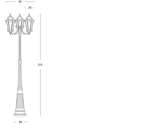 Hochmastleuchte für den Garten mit drei Lichtern in schwarzer und grüner Farbe für den Außenbereich, geschwungene Linie. Struktur aus Aluminium-Druckguss. Korrosionsschutzbehandlung. Epoxid-Pulverlackierung. Diffusoren aus geschliffenem und gebogenem transparentem Glas. Passende Lampenfassungsabdeckung aus Aluminium. E27-Lampenfassung aus Porzellan. Inklusive Befestigungszubehör. Geeignet für Glühlampen. Für Energiesparlampen geeignet. Max. Lampenhöhe mm 240. Stromversorgung 230 V ~ 50 Hz. Anschlussvorrichtung. Bodenbefestigungsdreieck. Schutzklasse: IP43 Anzahl Lampen: 3 Maximale Lampenleistung: 100W