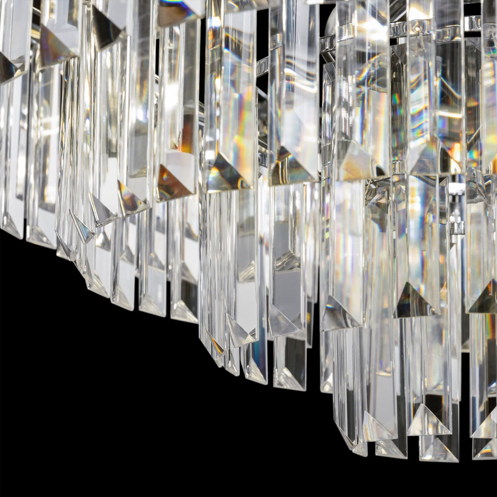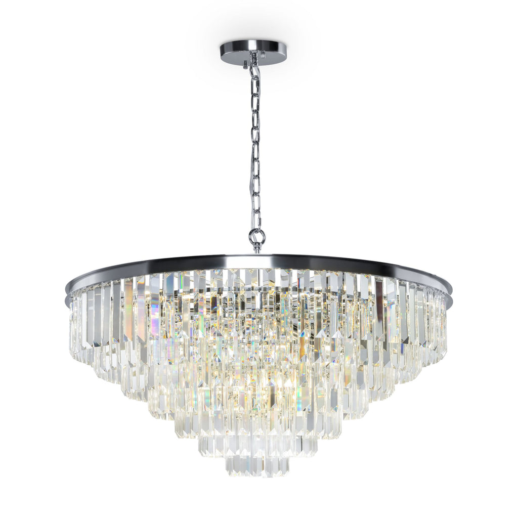 Abgehängte Kristallelemente mit mehreren Ebenen. Die Metallstruktur ist in Chrom- oder Messingfarbe lackiert. Die Höhe der Lampen ist verstellbar