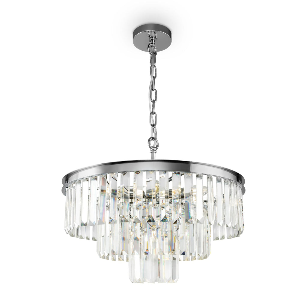 Abgehängte Kristallelemente mit mehreren Ebenen. Die Metallstruktur ist in Chrom- oder Messingfarbe lackiert. Die Höhe der Lampen ist verstellbar
