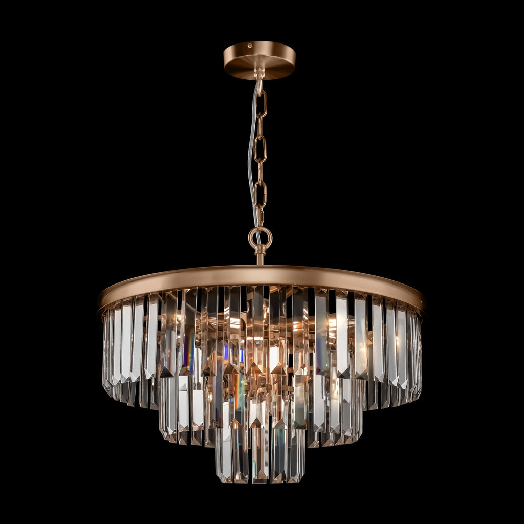 Abgehängte Kristallelemente mit mehreren Ebenen. Die Metallstruktur ist in Chrom- oder Messingfarbe lackiert. Die Höhe der Lampen ist verstellbar