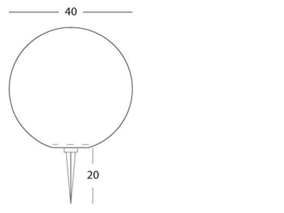 Bodenkugellampe Durchmesser 40 mm weiße Farbe für Outdoor-Lounge-Linie. Struktur vollständig aus hochbeständigem Harz. 2 m Netzkabel H05RN-F komplett mit Schukostecker. PG9 Eingangskabelverschraubung. Stütz- und Befestigungspfahl. Lampenfassung aus Porzellan mit Fassung E27. Geeignet für Glüh- und Energiesparlampen. Interner Diffusor aus transparentem Thermoplast inklusive. Möglicher farbiger Diffusor nicht im Lieferumfang enthalten, siehe Abschnitt Zubehör. Lampe nicht enthalten. Stromversorgung 230V ~ 50Hz. Schutzklasse: IP54 Maximale Lampenleistung: 40W