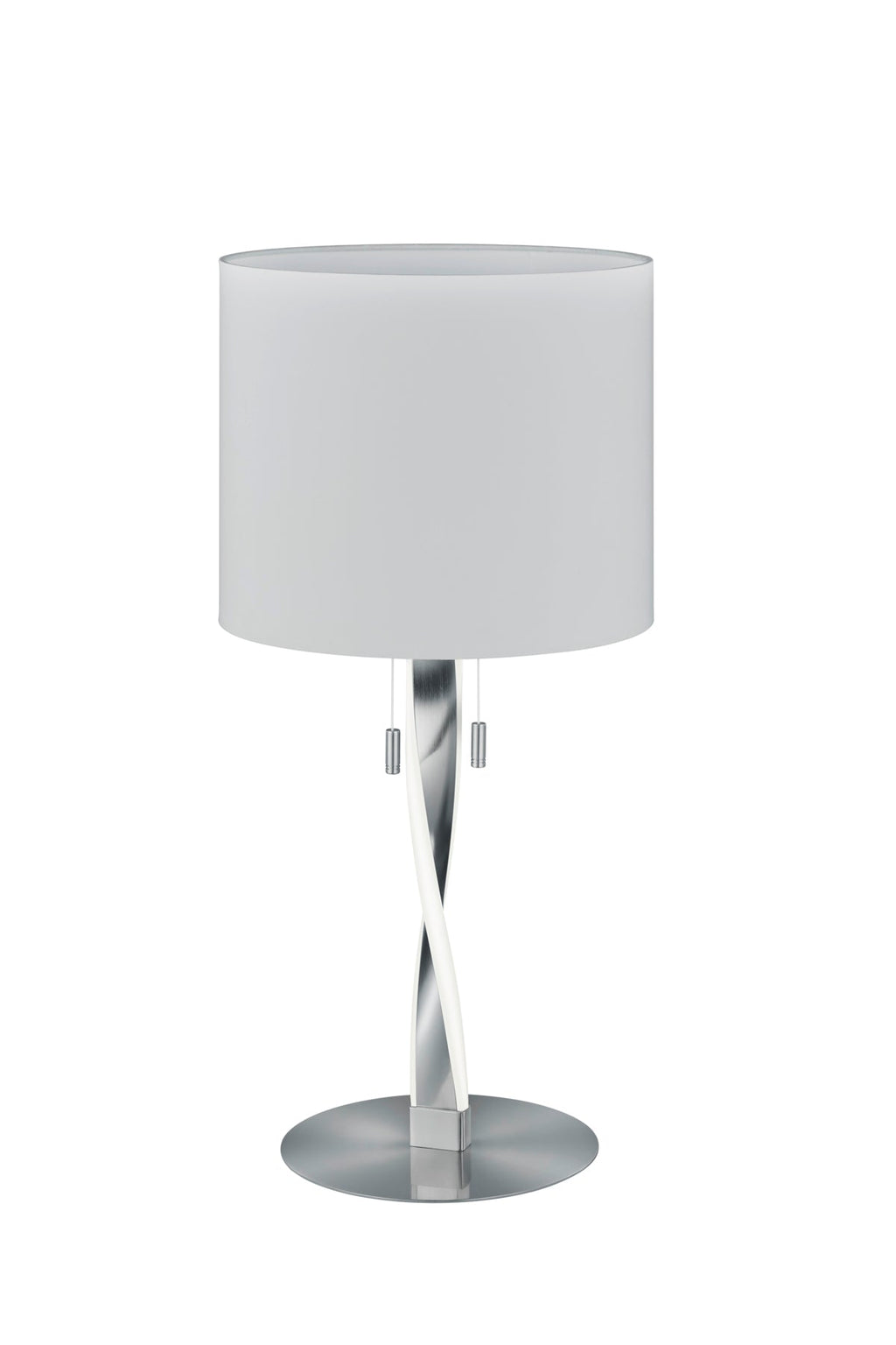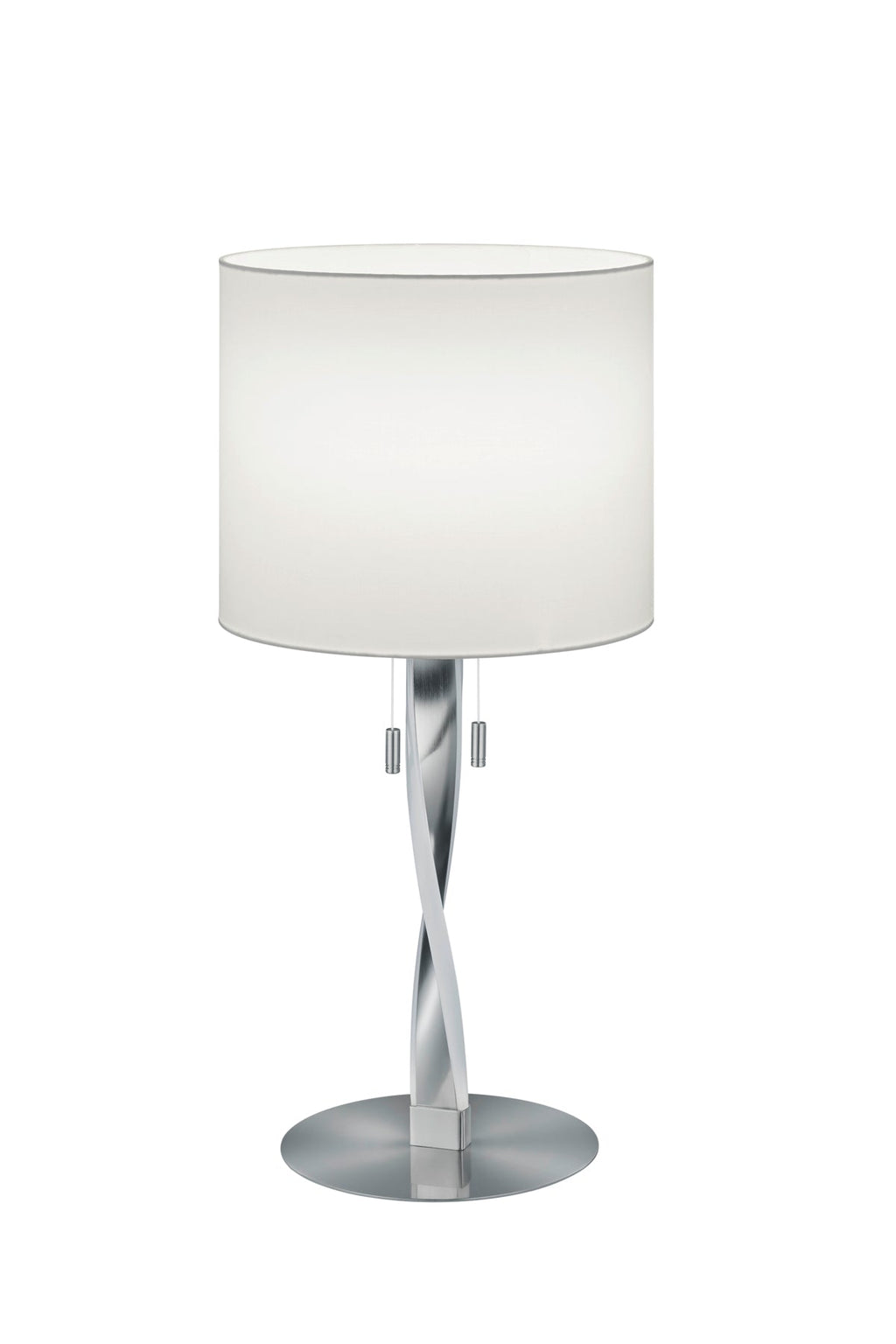 Nandor Tischlampe mit weißem Lampenschirm und LED-beleuchtetem Schraubenstab aus satiniertem Stahl mit separaten Schaltern H.62Cm