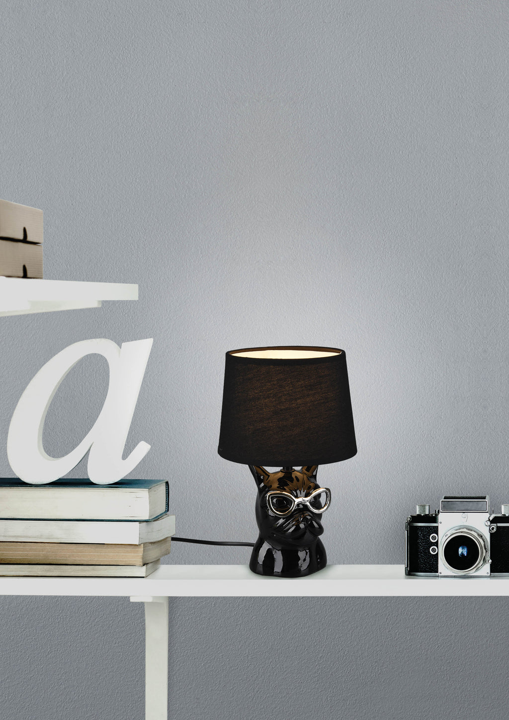 Dosy Schwarze Keramik-Tischlampe Bulldogge mit Gläsern H. 29Cm