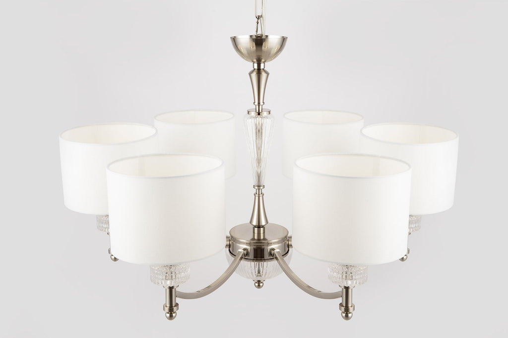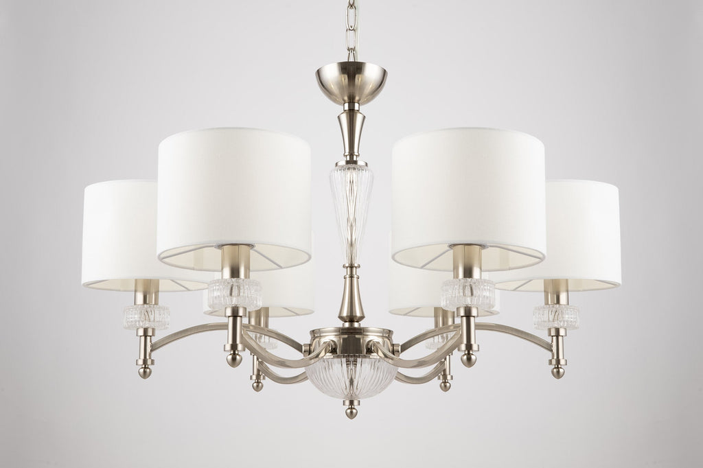 Metallstruktur, dekorative Elemente aus Glas. Lampenschirme mit Stoff bezogen.