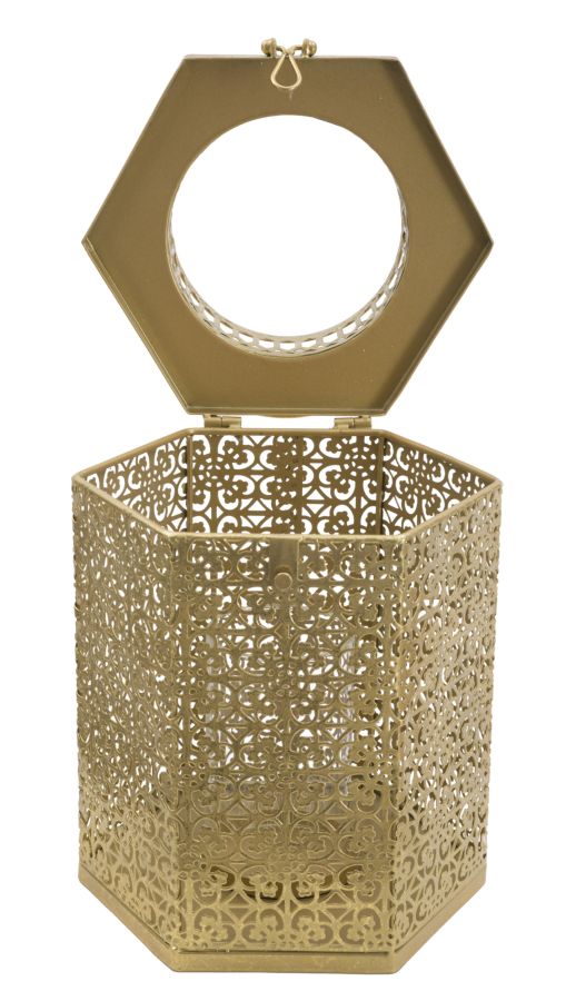 Elegante Laterne mit goldenem Metallgriff. Die besonderen Schnitzereien, beleuchtet von einer Kerze, machen jeden Raum magisch.
