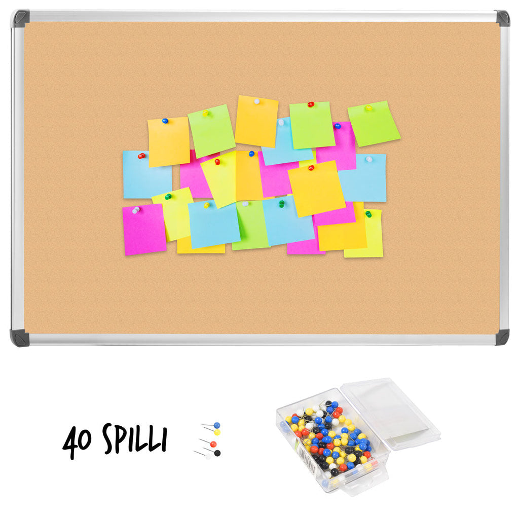 La lavagna da parete è realizzata in alluminio anodizzato silver, conferendole un aspetto moderno e resistente. Gli angoli di protezione in ABS assicurano un'ulteriore protezione dagli urti. La superficie in sughero naturale, spessa 2 mm, permette di fissare i fogli con comode puntine. La lavagna è posizionabile sia in verticale che in orizzontale, grazie al kit per fissaggio a muro incluso. Le sue dimensioni di 90x60 cm la rendono perfetta per utilizzarla in vari contesti, come l'ufficio o la sala riunioni.