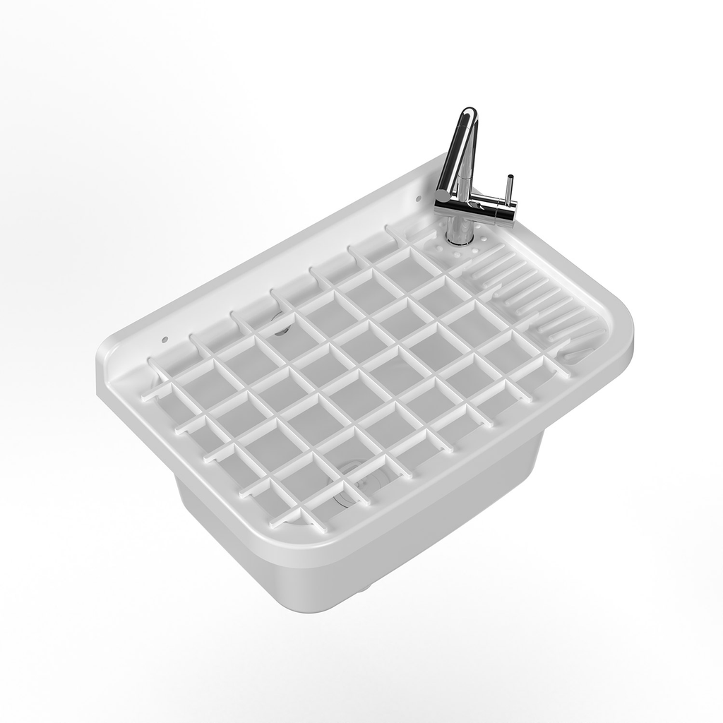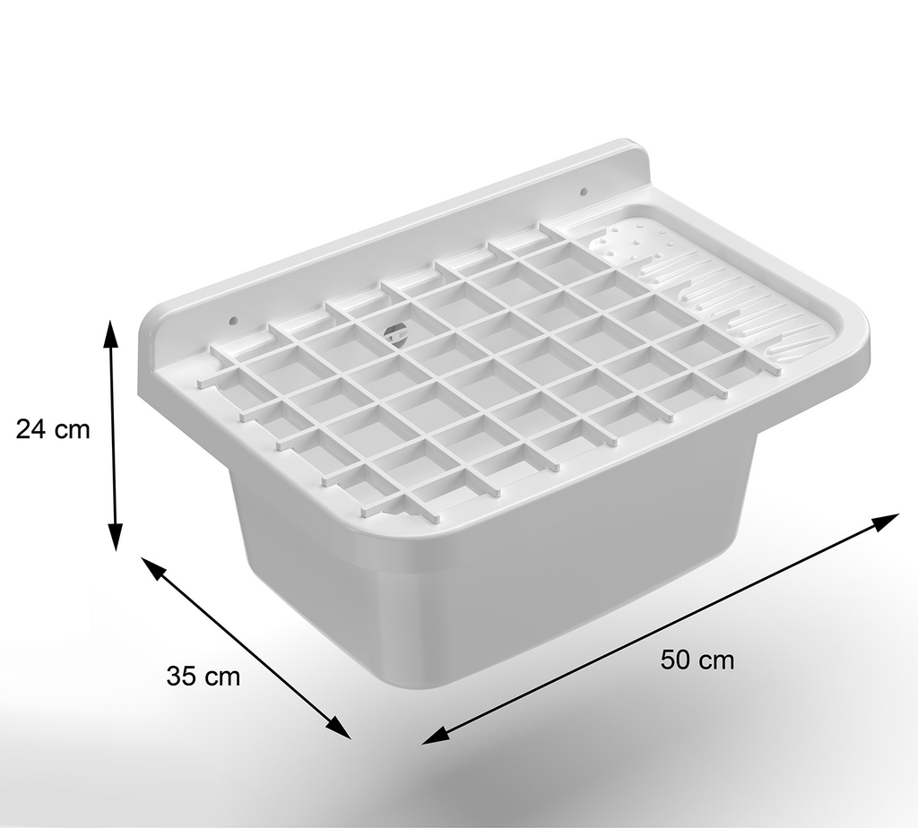 Il pilozzo, vasca a parete di dimensioni 50L x 35P x 24H cm in resina termoplastica di polipropilene, è il prodotto ideale per chi ha esigenze di spazio e praticità. Dotata di una griglia rimovibile, oltre ad essere di facile pulizia, la vasca è resistente ai detergenti e agli acidi di uso comune. Forabile per l’installazione di un rubinetto miscelatore o dispenser sul lato destro, si presta all’utilizzo sia in ambienti interni che esterni. Viene fornito completo di sistema di fissaggio a parete (staffa in PP, tasselli e viti) e sifone estensibile con piletta, troppopieno, ghiera con tappo e guarnizioni termoplastiche.