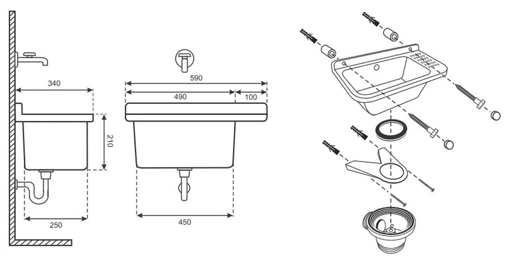 Siphon und Ablauf mit Überlauf sowie Schrauben zur Wandbefestigung im Lieferumfang enthalten .