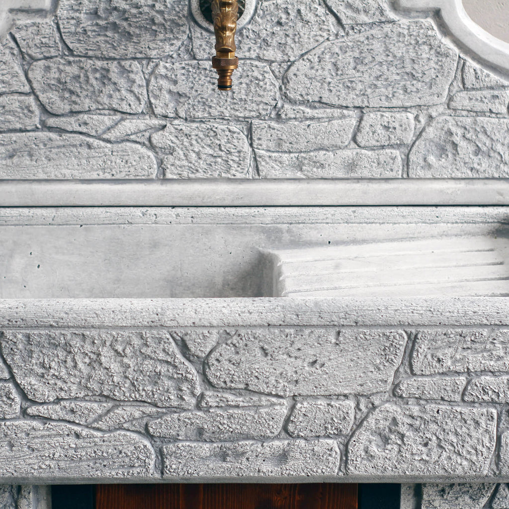 Lavandino in cemento con sgocciolatoio e presenta una texture rustica tipo sasso. Realizzato in cemento bianco e granuto di marmo, anticatura grigio. Tutte le quattro pareti laterali del lavandino sono rifinite. E' quindi possibile orientare vasca e sgocciolatoio in base alle necessitè. Prodotto 100% Made in Italy