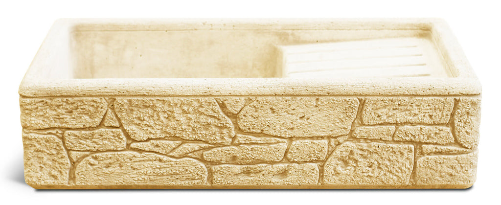 Lavandino in cemento con sgocciolatoio e presenta una texture rustica tipo sasso. Realizzato in cemento bianco e granuto di marmo, anticatura nocciola. Tutte le quattro pareti laterali del lavandino sono rifinite. E' quindi possibile orientare vasca e sgocciolatoio in base alle necessitè. Prodotto 100% Made in Italy