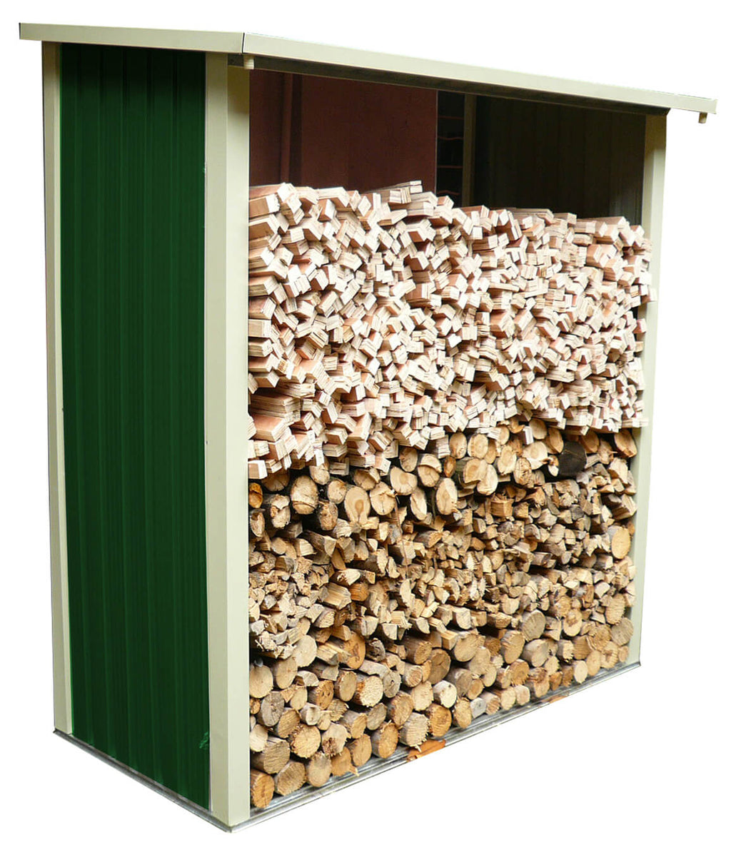 Lackierter Holzschuppen aus verzinktem Eisen (Rostschutzfarbe) in Grün und Beige.
