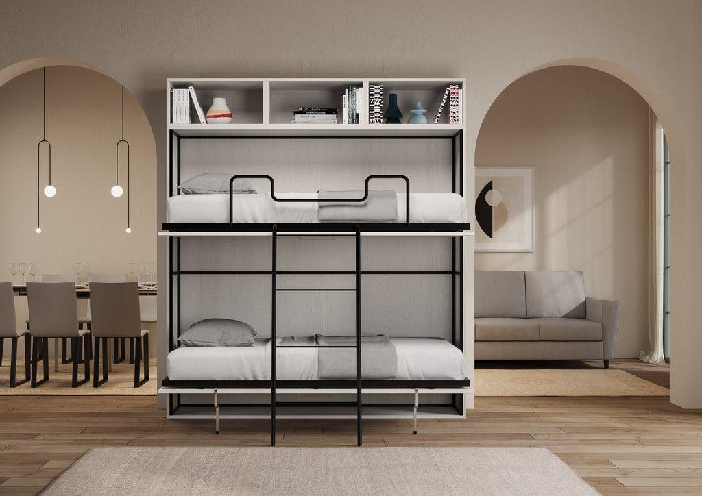 Kando L è un letto doppio a scomparsa con tre vani a giorno per riporre i propri oggetti. Una soluzione moderna ideale per un monolocale, bilocale o un open space, dove è necessaria una perfetta ottimizzazione degli spazi e delle superfici, questa composizione permette di sfruttare pienamente tutti gli ambienti a propria disposizione, in questo modo si può sfruttare al meglio lo spazio a disposizione in quanto la profondità del mobile è di soli 39,2 cm. Kando L offre il comfort e il relax di due letti da una piazza, con il suo design versatile e moderno si adatta a qualsiasi stile di arredamento. È ideale per chi vive in un monolocale o in un ambiente con spazi limitati e vuole avere più superficie libera durante il giorno.
