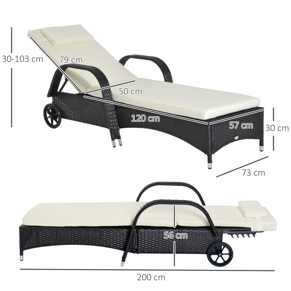 Liegende Garten-Sonnenliege aus PE-Rattan mit gepolsterter Matratze und schwarzen Rädern