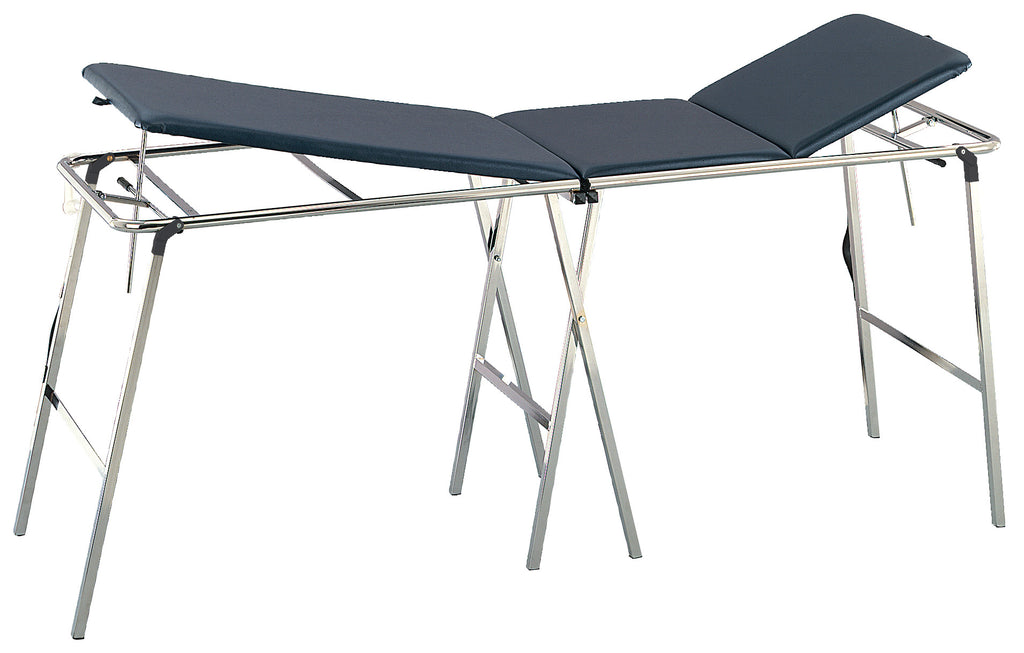 Klappbare Massageliege "MEDICAL" mit Gestell aus verchromtem Stahlrohr. Kopfteil und planar verstellbar mit selbstsicherndem System. Standardpolsterung in schwarzem Skai.