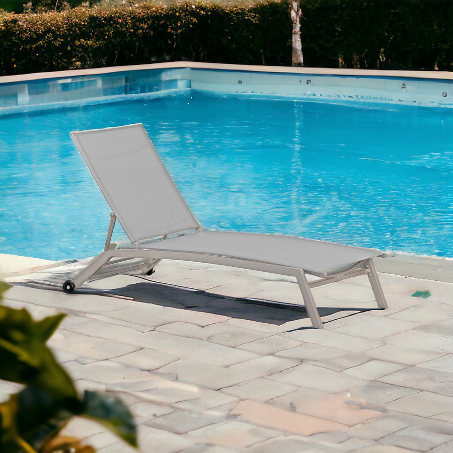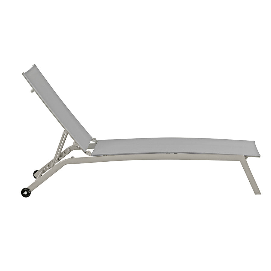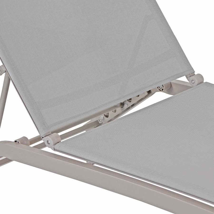 Il lettino da giardino è realizzato con struttura in acciaio con verniciatura a polvere ecrù ed un comodo e fresco tessuto premium 610gr/mq grigio.