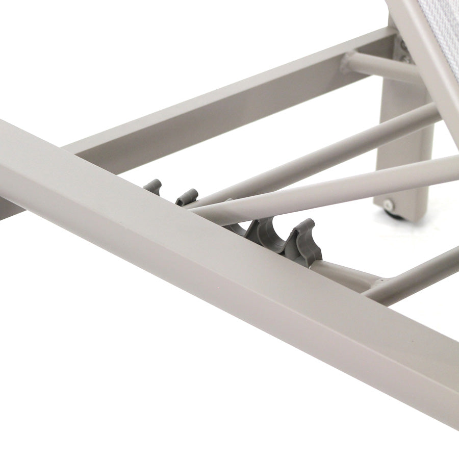 Il lettino in alluminio con ruote da giardino è un complemento di arredo esterno innovativo e di design. La struttura ergonomica e comoda di questo lettino permette il massimo comfort consentendoti di vivere al meglio gli spazi esterni. La struttura di questo lettino da giardino è in alluminio e la verniciatura a polvere epossidica ha qualità peculiari di adesione e flessibilità sul supporto, durezza e resistenza anticorrosiva. L'alluminio garantisce solidità e sicurezza. Lo schienale di questo lettino con ruote è regolabile in 5 posizioni differenti. Schienale e seduta sono realizzati in textilene di alta qualità 680gr/mq con tessitura 2*1, le ruote incassate consentono una facile mobilità del prodotto.