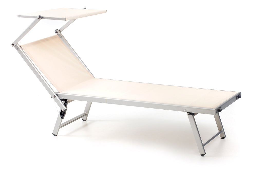 Sonnenliege für Garten, Strand und Schwimmbad mit Aluminiumstruktur, verstellbarer Rückenlehne in 2 Positionen, verstellbarem Sonnendach, 1000 g/m2 Textilene-Gewebe in Ecru-Farbe, Edelstahlstifte, Nylon-Kunststoff.