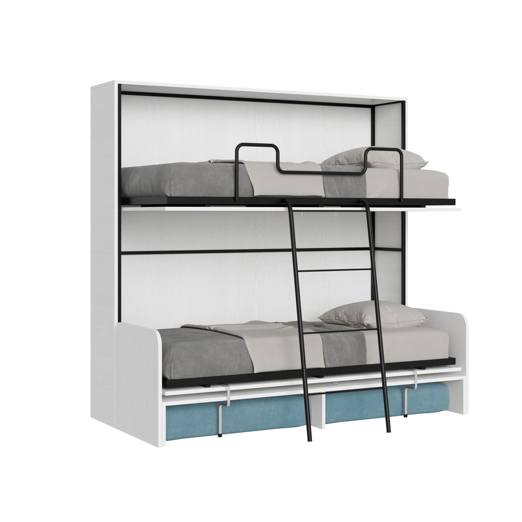 Letto a scomparsa orizzontale Kando versione con due letti singoli a castello con divano. Questo mobile salvaspazio è ideale per il living: funge da divano comodo di giorno e si trasforma velocemente in un letto confortevole quando serve, offrendo sia comfort che praticità, ideale per chi ha a disposizione spazi ridotti. I cuscini del divano, completamente sfoderabili, sono realizzati in microfibra. Il colore del rivestimento come immagini. Struttura del letto e del divano realizzate con pannelli di particelle di legno nobilitato sp.18 mm .Struttura della rete in ferro rinforzato verniciato a polvere epossidica colore alluminio goffrato. Il meccanismo di apertura è provvisto di un sistema anti-chiusura con bloccaggio di sicurezza con maniglie di sgancio laterali. Incluso di rete ortopediche realizzate in doghe di legno lamellare da 85x190 cm con cinghie ferma materasso. Materassi in waterfoam da cm 85x185 H.14 inclusi. Caratteristiche materassi: ricamo di trapuntatura ornamentale, tessuto damascato con lavorazione jaquard di colore grigio con imbottitura in ovatta cardata e agugliata. Lastra in waterfoam elastico, schiuma poliuretanica ecocompatibile. Il letto rimane stabile grazie ad un meccanismo di sicurezza interno che ne assicura la rigidità. Il letto può essere aperto a propria necessità, solo il letto superiore, solo il letto inferiore o entrambi contemporaneamente. Il letto inferiore è dotato di piedini estraibili che consentono alla rete inferiore di poggiare a terra in tutta sicurezza, mentre il letto superiore è dotato di pratiche scalette per scendere o salire. La discesa dei letti è agevolata dalle maniglie incluse.