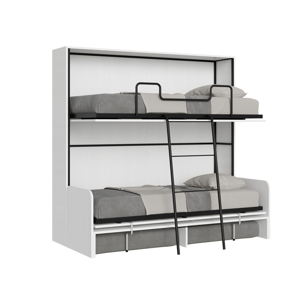Letto a scomparsa orizzontale Kando versione con due letti singoli a castello con divano. Questo mobile salvaspazio è ideale per il living: funge da divano comodo di giorno e si trasforma velocemente in un letto confortevole quando serve, offrendo sia comfort che praticità, ideale per chi ha a disposizione spazi ridotti. I cuscini del divano, completamente sfoderabili, sono realizzati in microfibra. Il colore del rivestimento come immagini. Struttura del letto e del divano realizzate con pannelli di particelle di legno nobilitato sp.18 mm .Struttura della rete in ferro rinforzato verniciato a polvere epossidica colore alluminio goffrato. Il meccanismo di apertura è provvisto di un sistema anti-chiusura con bloccaggio di sicurezza con maniglie di sgancio laterali. Incluso di rete ortopediche realizzate in doghe di legno lamellare da 85x190 cm con cinghie ferma materasso. Materassi in waterfoam da cm 85x185 H.14 inclusi. Caratteristiche materassi: ricamo di trapuntatura ornamentale, tessuto damascato con lavorazione jaquard di colore grigio con imbottitura in ovatta cardata e agugliata. Lastra in waterfoam elastico, schiuma poliuretanica ecocompatibile. Il letto rimane stabile grazie ad un meccanismo di sicurezza interno che ne assicura la rigidità. Il letto può essere aperto a propria necessità, solo il letto superiore, solo il letto inferiore o entrambi contemporaneamente. Il letto inferiore è dotato di piedini estraibili che consentono alla rete inferiore di poggiare a terra in tutta sicurezza, mentre il letto superiore è dotato di pratiche scalette per scendere o salire. La discesa dei letti è agevolata dalle maniglie incluse.