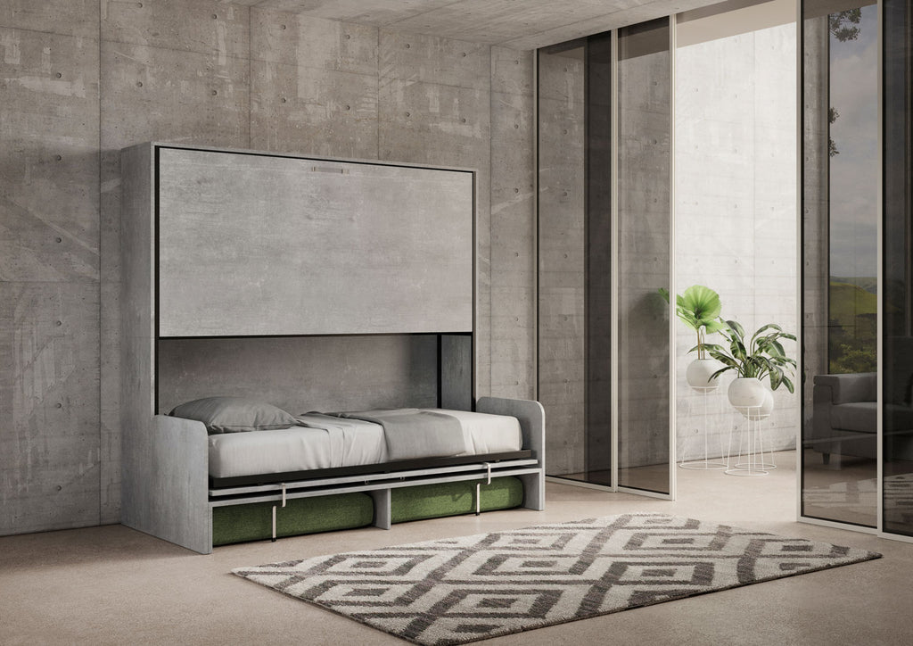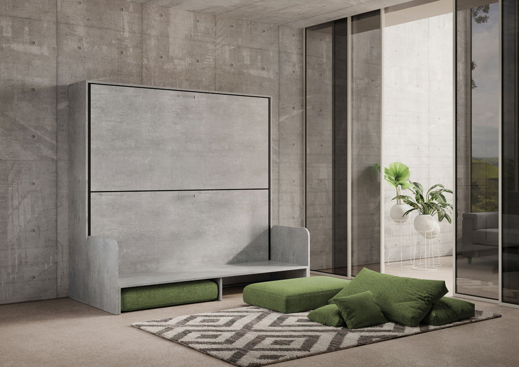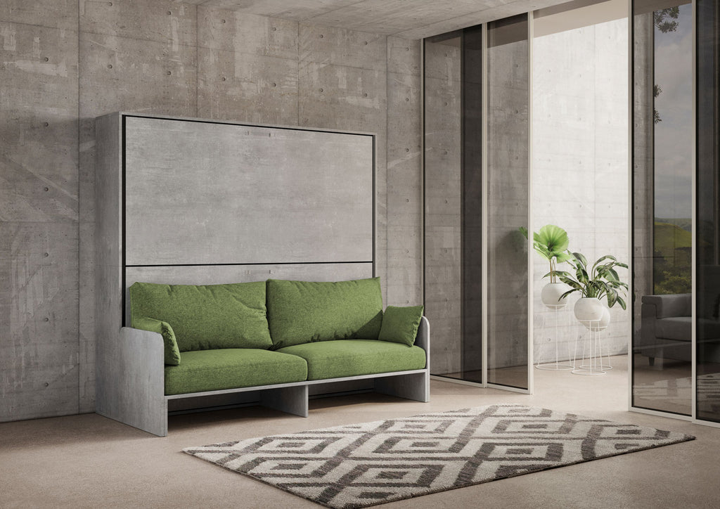 Letto Doppio A Scomparsa Kando Con Divano Con Materassi Cemento e Verde