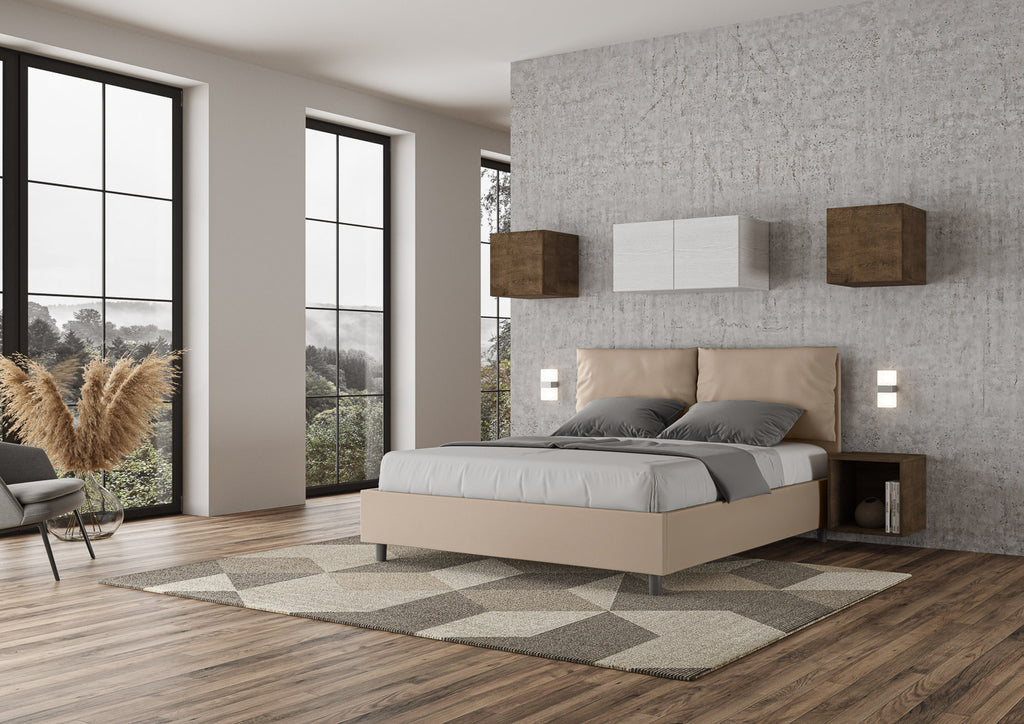 Letto matrimoniale in varie misure Antea con testata e Letto imbottiti, rivestimento in similpelle, particolarmente versatile e facilmente abbinabile a qualsiasi stile di arredamento. Il letto matrimoniale Antea è caratterizzato da uno stile elegante e raffinato grazie all'ampia cuscinatura presente sulla testata, è interamente rivestito in similpelle. La presenza del materiale in similpelle, oltre a donare alla stanza un'atmosfera accogliente ed invitante, offre la comodità di una pulizia facile e veloce, grazie all'utilizzo di un semplice panno in microfibra. Letto fornito con rete contenitore con doppia alzata. Rivestimento cuscini sfoderabile.