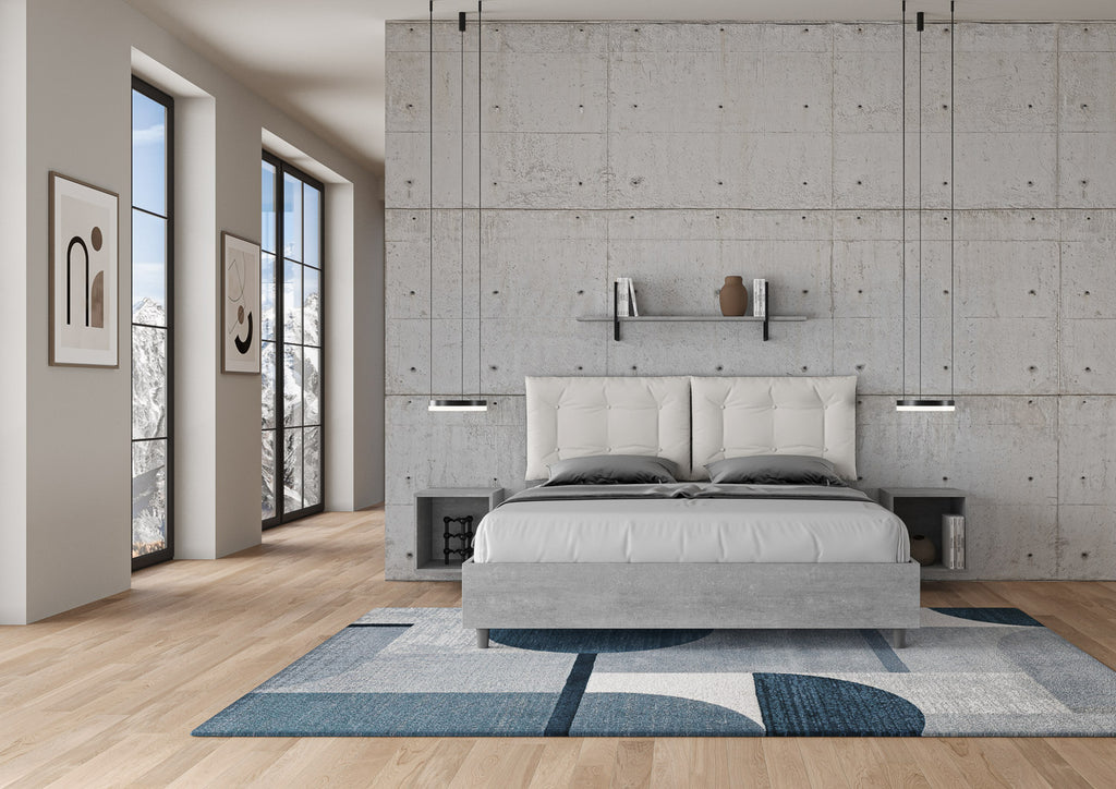 Letto matrimoniale in varie misure Egos Annalisa con testata e Letto in pannelli di nobilitato, con cuscini rivestiti in similpelle, particolarmente versatile e facilmente abbinabile a qualsiasi stile di arredamento. Il letto matrimoniale Egos Annalisa è caratterizzato da uno stile minimal e versatile grazie alle superfici semplici e lineari effetto cemento e alla cuscinatura rivestita in similpelle presente sulla testata. Grazie all'ampia cuscinatura in similpelle posizionata in cima alla testata, il letto è in grado di offrire il massimo comfort per la vostra postura. Questa combinazione conferirà alla vostra stanza un ambiente caldo ed accogliente. Letto fornito con rete contenitore con doppia alzata. Materasso non incluso. Rivestimento cuscini non sfoderabile.
