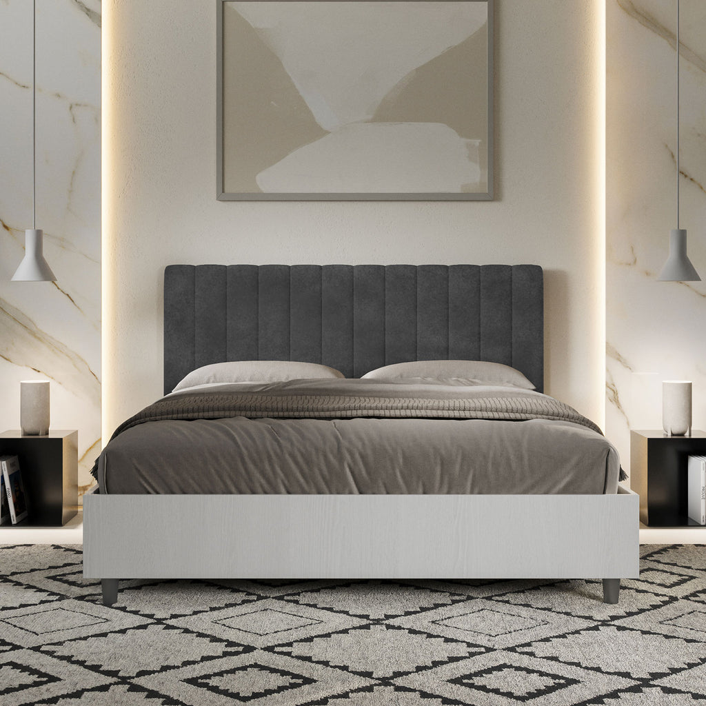 Letto Matrimoniale con Rete e Contenitore Alzata Comoda Struttura Bianco Frassico e Testata in Microfibra Kaia Grigio Varie Misure