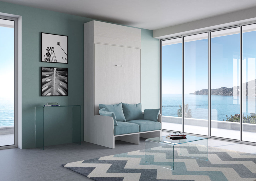 Letto Matrimoniale Francese A Scomparsa 140 Kentaro Con Divano E Pensile Bianco Frassino e Azzurro