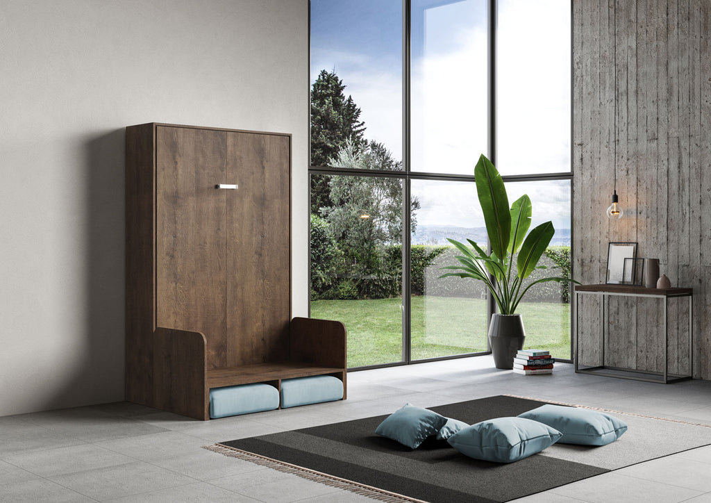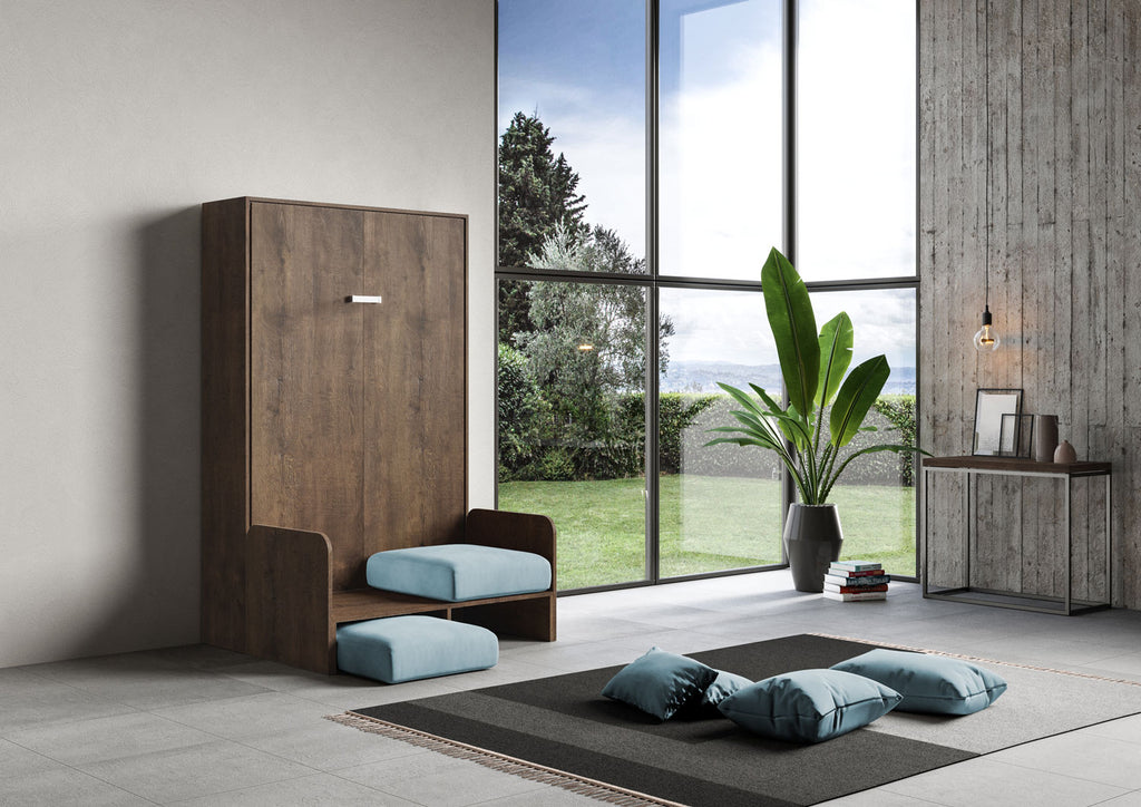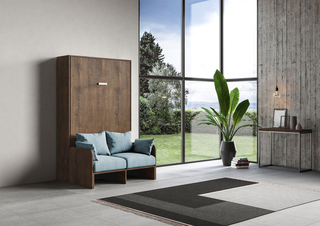 Letto Matrimoniale Francese A Scomparsa 140 Kentaro Con Divano Noce e Azzurro