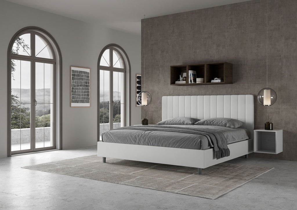 Letto matrimoniale in varie misure Agueda con testata e giroletto imbottiti, rivestimento in similpelle, particolarmente versatile e facilmente abbinabile a qualsiasi stile di arredamento. Il letto matrimoniale Agueda è caratterizzato da uno stile moderno ed elegante, evidenziato dalla testiera trapuntata rivestita in similpelle. La presenza del materiale in similpelle, oltre a donare alla stanza un'atmosfera accogliente ed invitante, offre la comodità di una pulizia facile e veloce, grazie all'utilizzo di un semplice panno in microfibra. Rivestimento letto non sfoderabile.