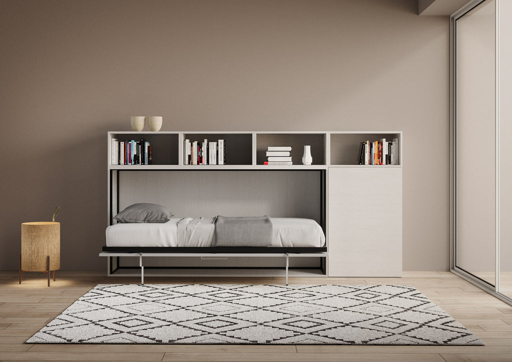 Kando A è un letto singolo a scomparsa che si integra con una composizione di mobili (un vano con anta e ripiano interno e quattro vani aperti). Una soluzione moderna ideale per un monolocale, bilocale o un open space, dove è necessaria una perfetta ottimizzazione degli spazi e delle superfici, questa composizione permette di sfruttare pienamente tutti gli ambienti a propria disposizione. Originale e funzionale, che consente di ottimizzare lo spazio disponibile, occupando solo 39,2 cm di profondità quando è chiuso. Quando è aperto, offre il comfort e il relax di un letto da una piazza.