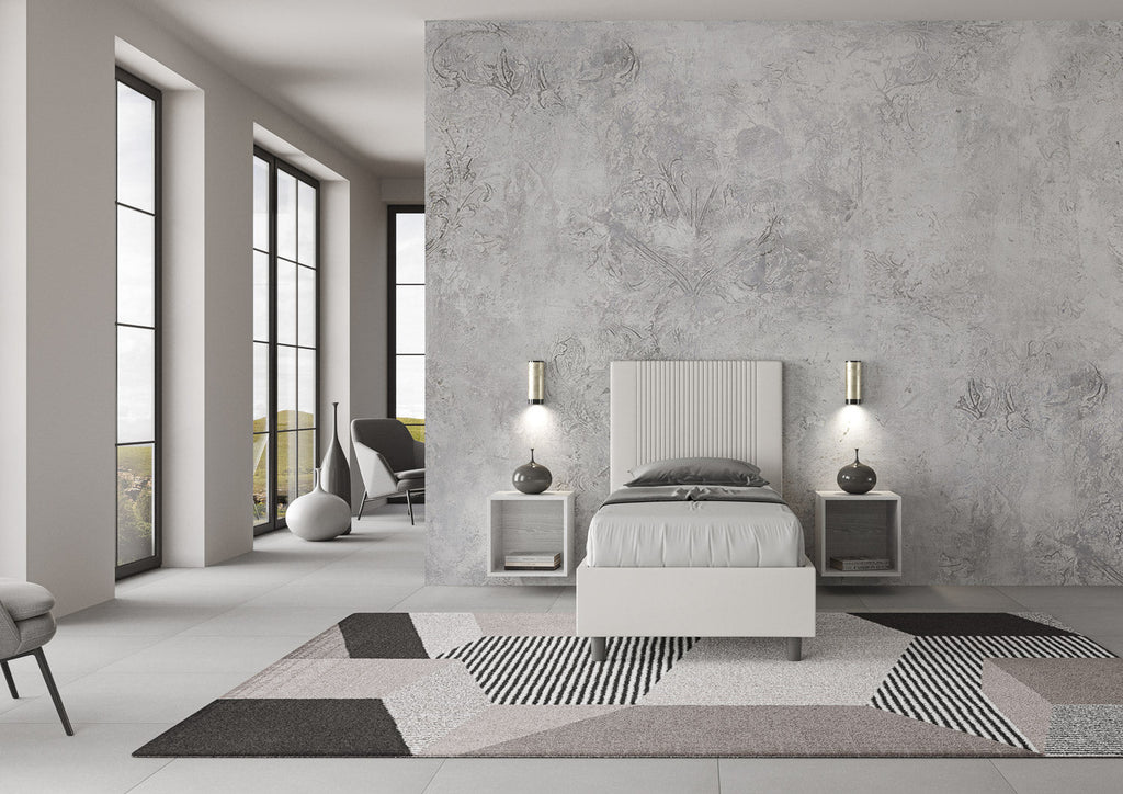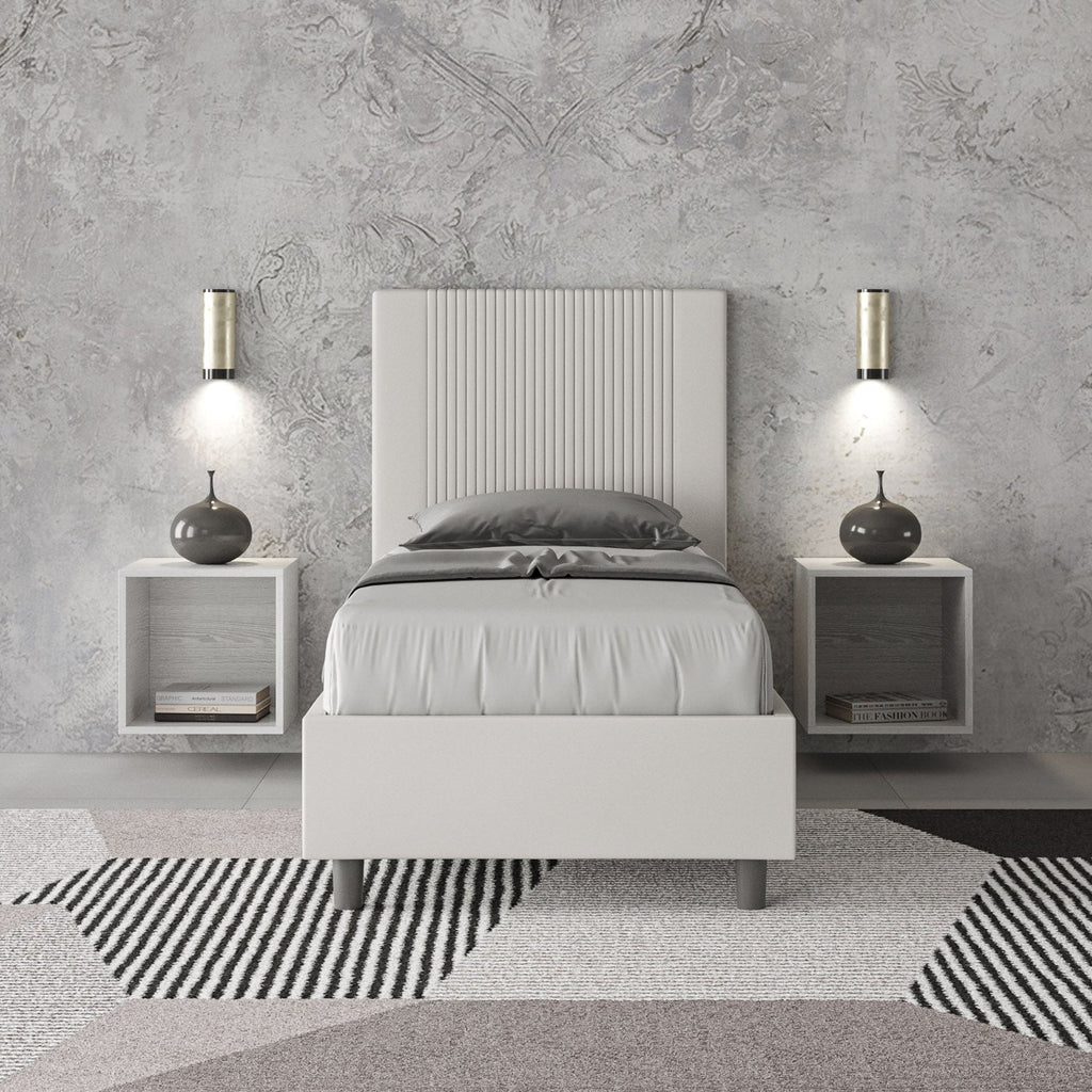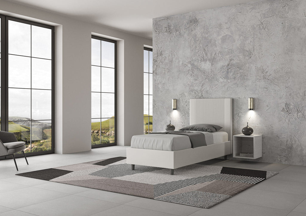 Letto singolo modello Goya con giroletto imbottito. Il modello Goya è un letto in similpelle di manifattura interamente italiana, dal design sobrio e fresco, arreda alla perfezione ambienti contraddistinti da uno stile elegante e raffinato. Il punto di forza è decisamente la testata, finemente decorata con una fantasia a linee verticali, eccezionale per voi che siete alla ricerca di un prodotto da abbinare ad una camera d’effetto, con pareti importanti, senza rinunciare ad un tocco di classe. Letto fornito con rete a doghe, predisposto per materasso L.100 P.200