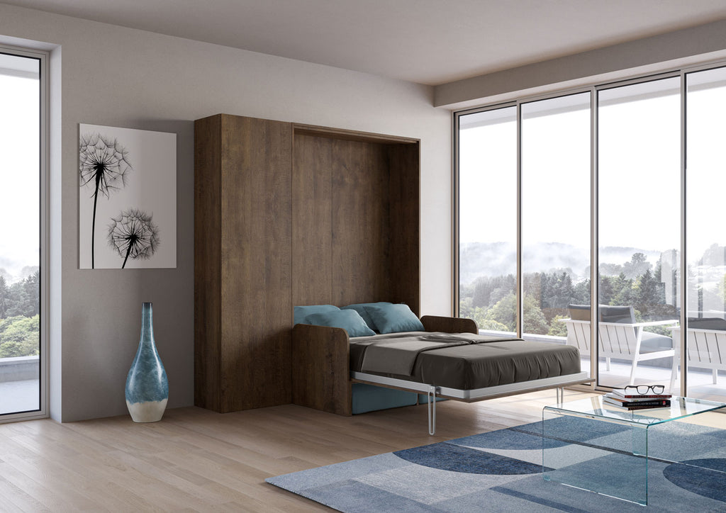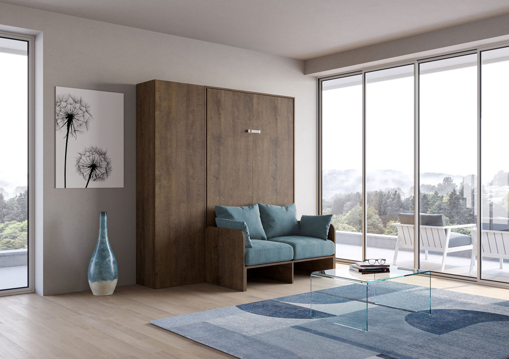 Letto Una Piazza E Mezzo A Scomparsa 120 Kentaro Con Divano E Colonna Noce e Azzurro