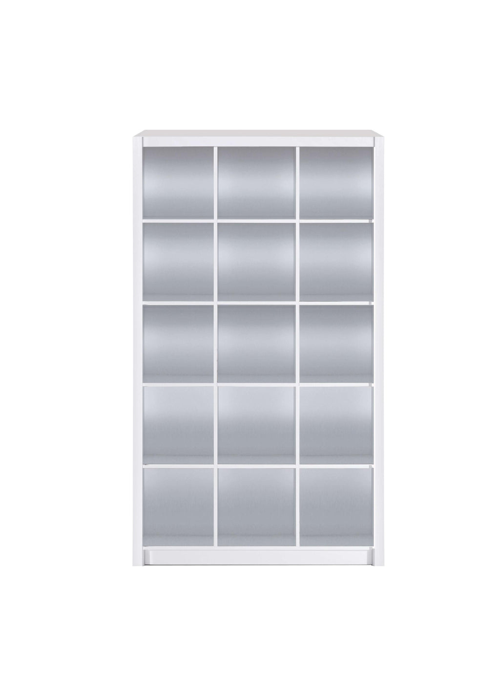 - Regal 3 Säulen mit je 5 Ebenen für insgesamt 15 Fächer.