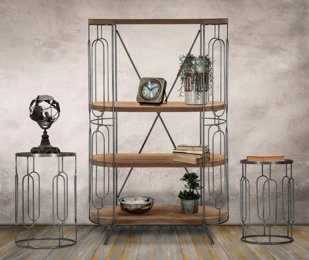 Bücherregal aus Metall mit 4 Holzregalen mit abgerundeten Linien. Das weiche und elegante Design verleiht jeder industriellen Umgebung einen Hauch von Ausgewogenheit.