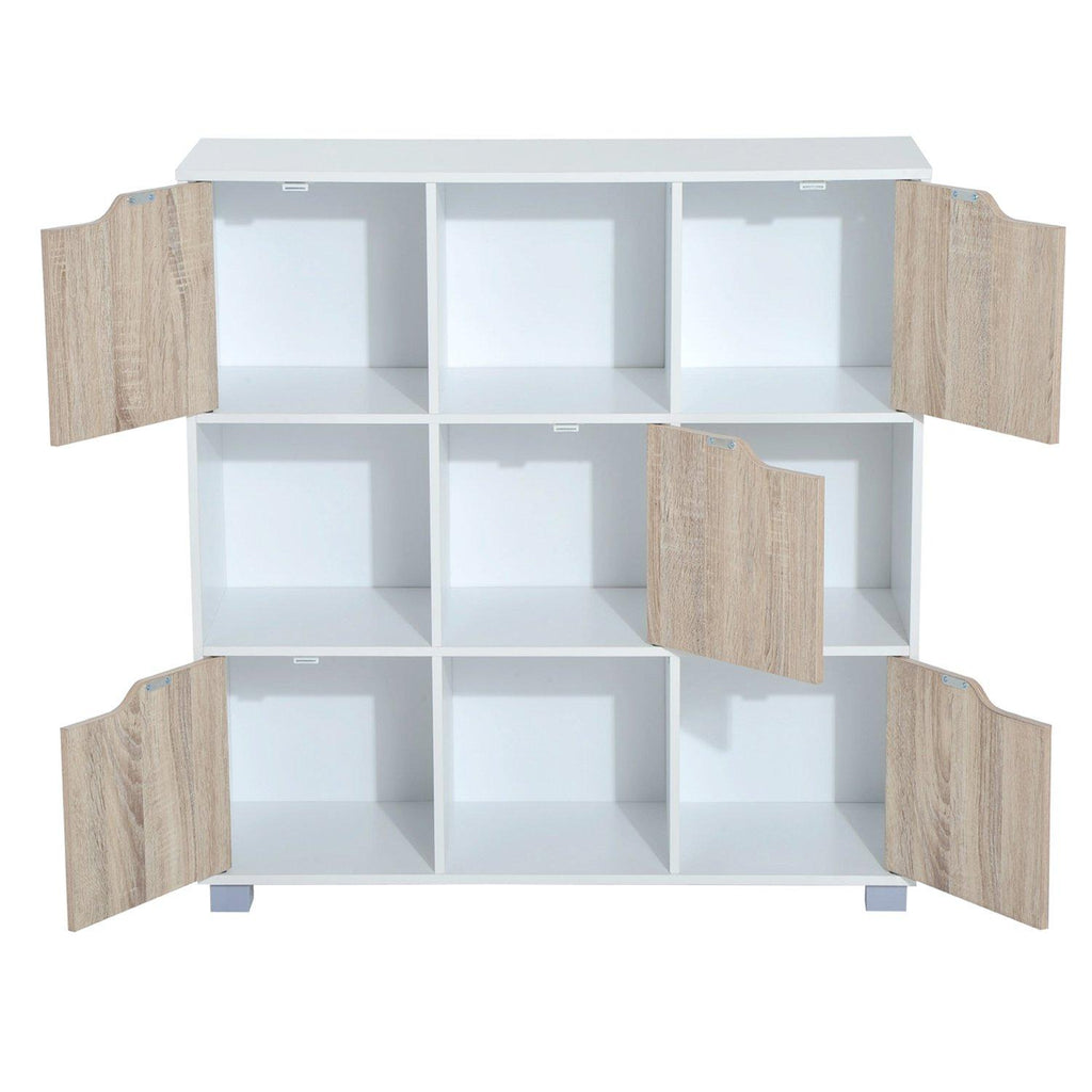 - Es hat 9 Fächer, davon 5 mit Türen und 4 offen