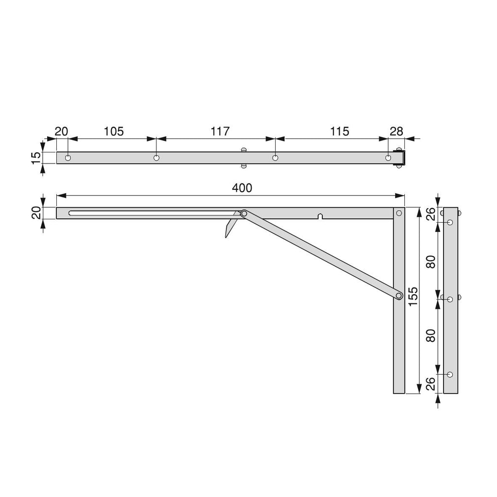 - Länge der Halterungen: 400 mm. Maximale Belastung von 60 kg für Regale mit zwei Konsolen.