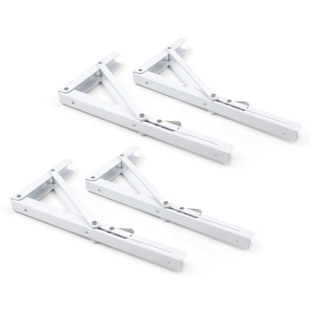 Set mit 4 Klapphalterungen zur Positionierung von Regalen an der Wand. Erhältlich in den Größen 200 mm/300 mm/400 mm mit einer maximalen Tragfähigkeit von 40, 50 oder 60 kg für jede Ablage mit zwei Halterungen.